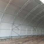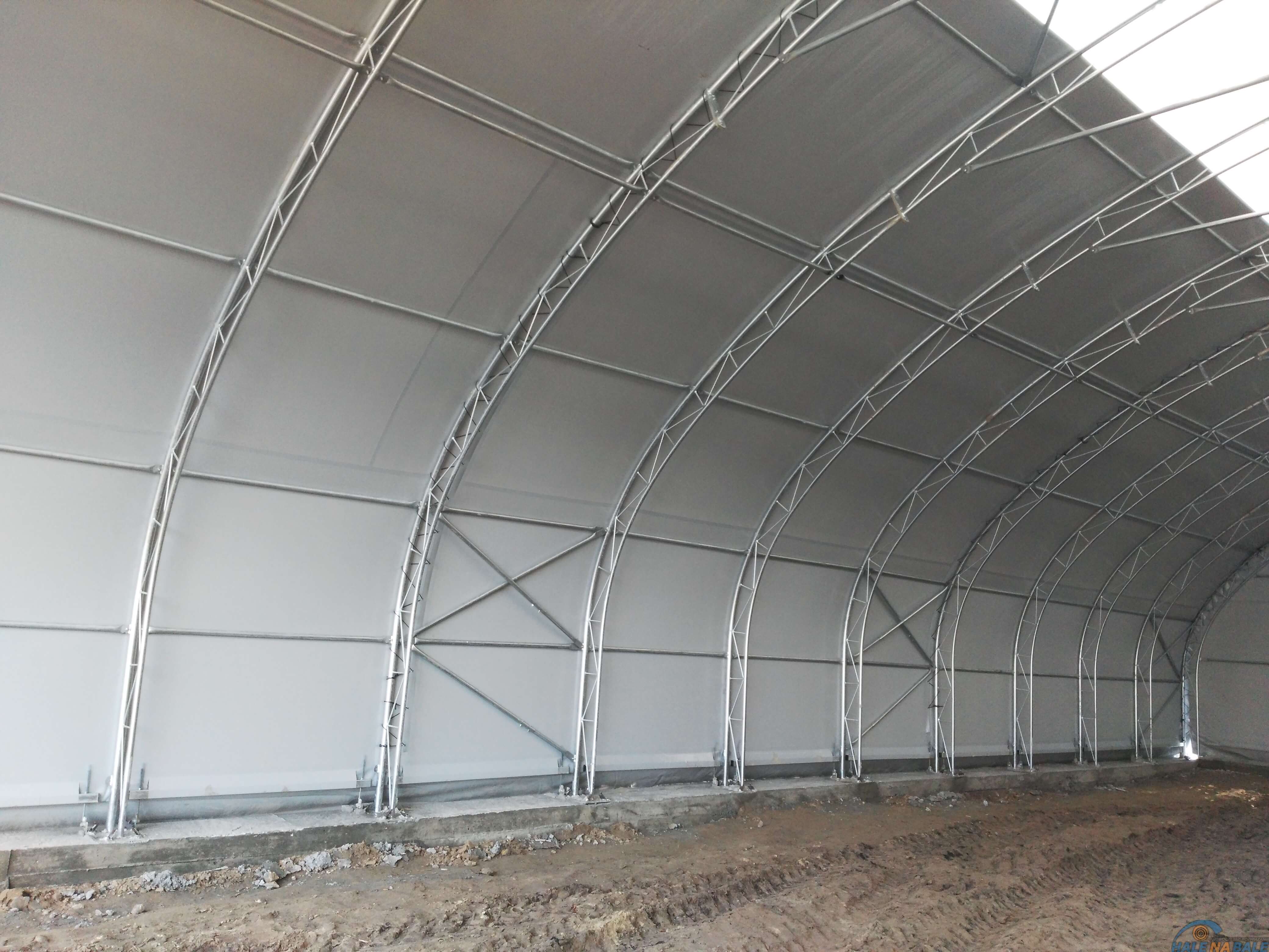 Niedawno oddaliśmy do użytku kolejną halę o wymiarach 12m x 24m z tylną ścianą szczytową zamkniętą na stałe. Tym razem głównym zadaniem hali jest osłona balotów słomy przed warunkami atmosferycznymi.